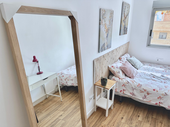 Disfruta de una habitación luminosa, acogedora y con estilo natural, con luz directa durante todo el día gracias a su orientación Sur y su posición en la última planta del edificio. Decorada con materiales cálidos como el bambú y detalles modernos, es ideal para quienes buscan comodidad, tranquilidad y un ambiente inspirador para vivir y estudiar o teletrabajar.
