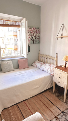 Disfruta de una habitación luminosa, tranquila y con encanto, con luz natural directa durante toda la mañana gracias a su orientación Este y sus vistas a un amplio patio interior. Decorada con detalles únicos como un mural textil de elefante y un espejo tipo cuento de hadas, esta habitación combina comodidad, estilo y un ambiente inspirador perfecto para relajarse o concentrarse.